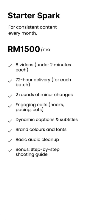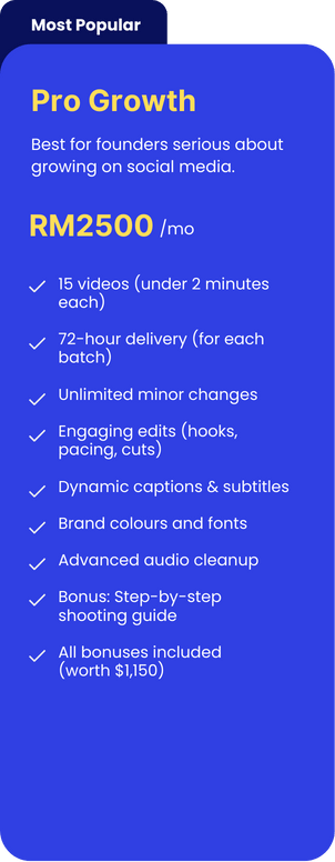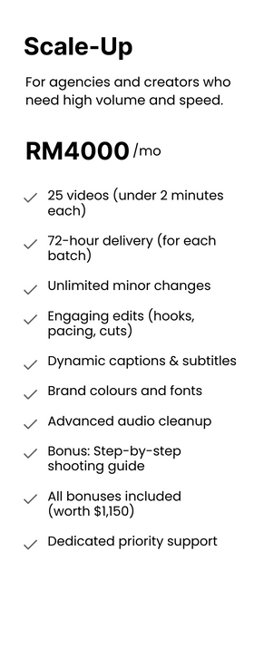 Our plans are built for ambitious SMEs and startups that need a consistent volume of high-quality content without the financial overhead. Get all the benefits of an in-house editing team for one predictable, flat monthly fee.